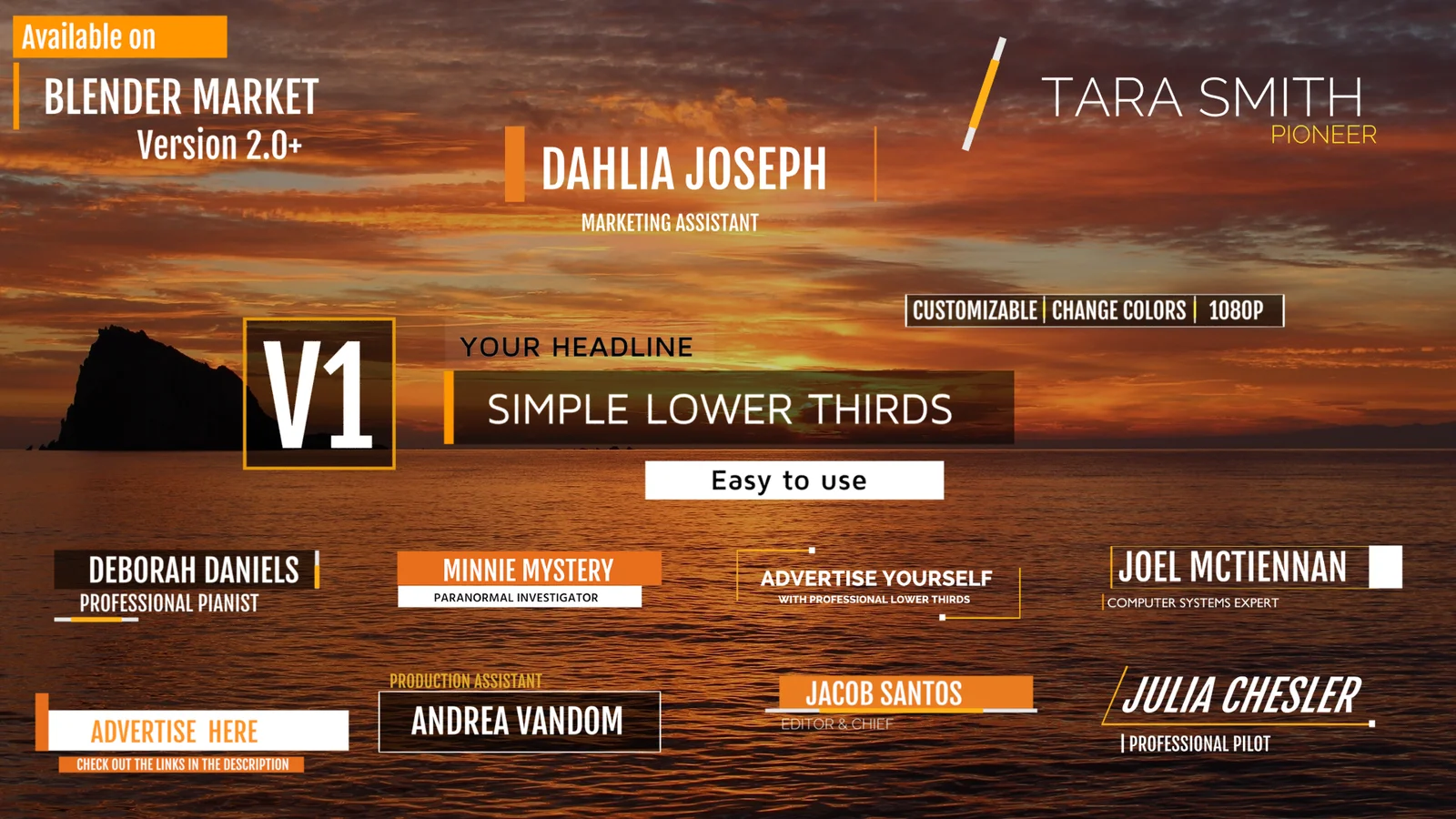 This pack contains 20 pre-animated lower third templates designed for motion graphics and video presentations. Built directly within Blender, each lower third is isolated on its own renderlayer to keep the scene organized and simplify the rendering process. The templates are configured for 1080p output and can be customized natively without the need for external plugins. An included tutorial guides users through the customization and rendering workflow.