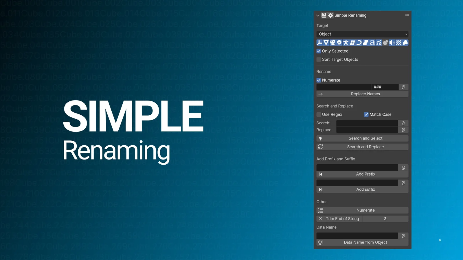 Simple Renaming is an addon that provides batch renaming capabilities for objects, materials, collections, and data blocks in Blender. It allows users to modify names across multiple assets simultaneously using features like search and replace, sequential numbering, and the addition of prefixes or suffixes. A key feature is the ability to sync object names directly with their underlying data blocks, maintaining consistency in the Outliner.