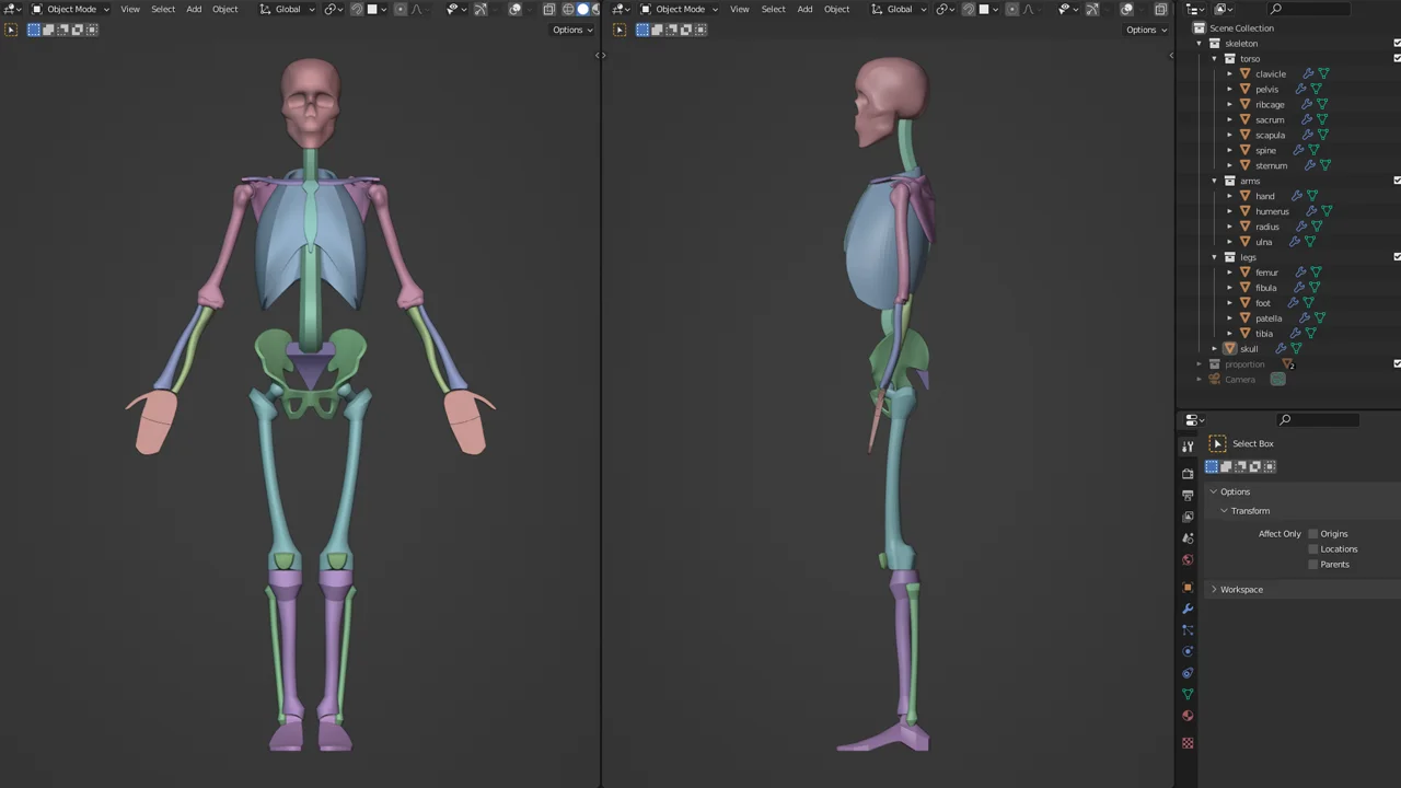 A 3D model of a simplified male skeleton intended for anatomy studies and proportion reference. The skeleton is proportioned to 7.5 head units and includes both a native Blender file and an FBX file.