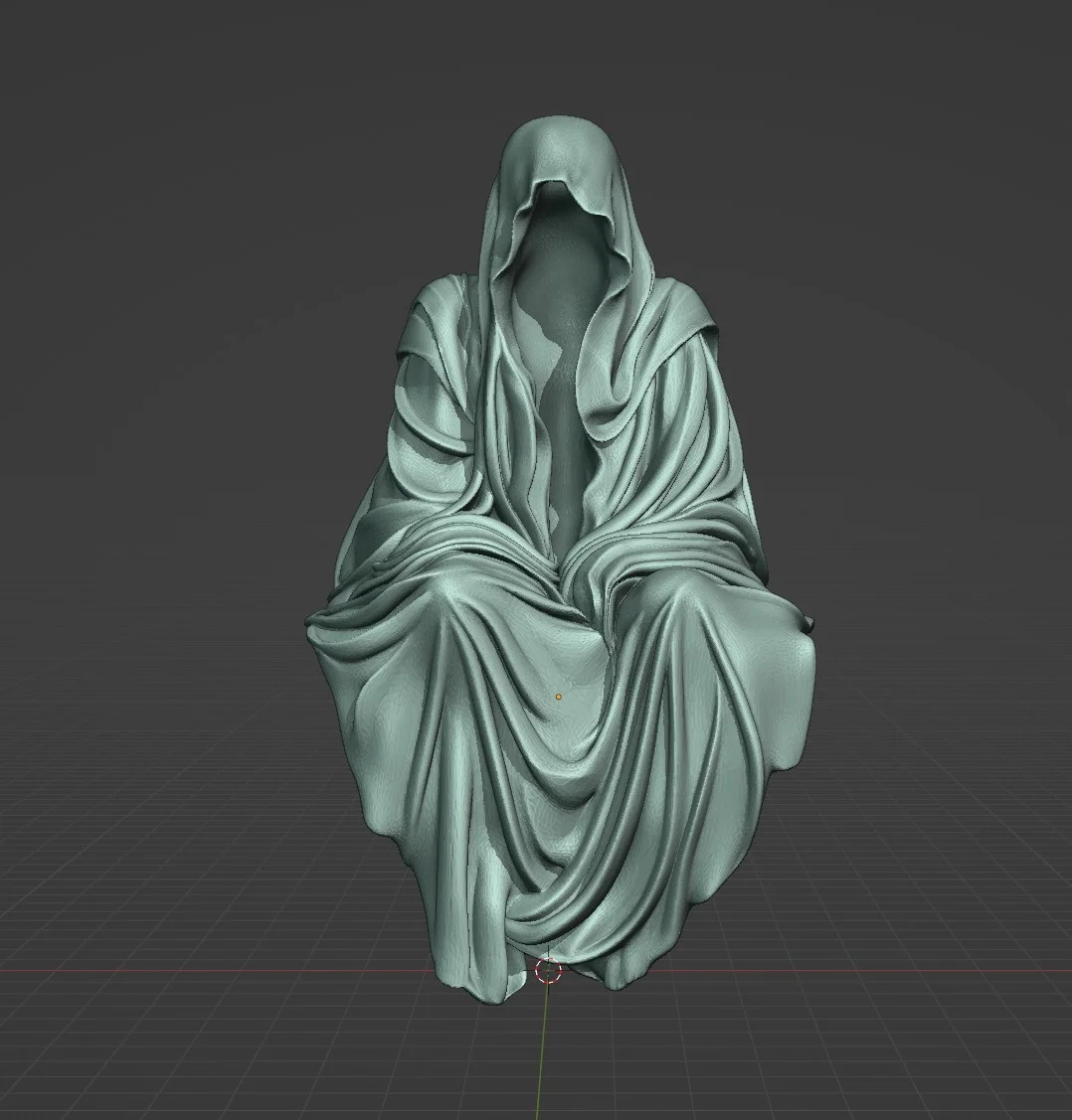 A 3D printable model of a sitting ghost or lurking spectre. The model is sculpted in high definition and optimized for 3D printing workflows. It measures 14 centimeters (5.5 inches) tall by default but can be scaled within any slicer software. The asset is provided in STL, OBJ, FBX, and native Blender file formats.