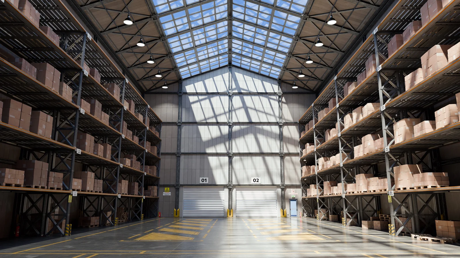 A high-poly 3D model of a small warehouse built to real-world scale (43m length, 21m width, 18m height). The model features clean topology and is ready to render directly upon opening.