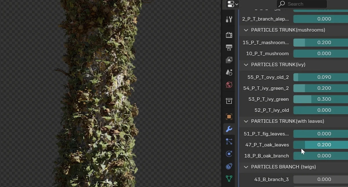 This geometry nodes asset package provides a system for generating close-up ready trees by scattering photo-scanned tree components over base meshes. The collection includes 38 customizable tree bases and 69 photo-scanned parts. The included node group can be applied to the provided bases or any imported third-party tree mesh to add high-resolution detail.