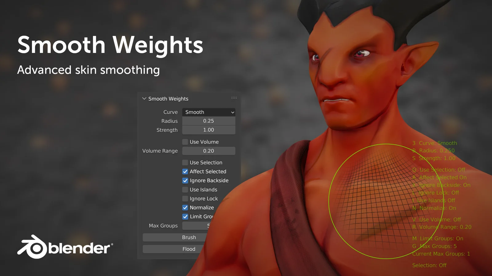 The add-on integrates directly into Blender's workflow with a built-in selection mode that operates in pose without switching to Edit Mode. It supports both position-based and topological symmetry, allowing for real-time mirroring of weights and vertex group assignments. Users can apply smoothing globally using the Flood feature or restrict it to selected areas.