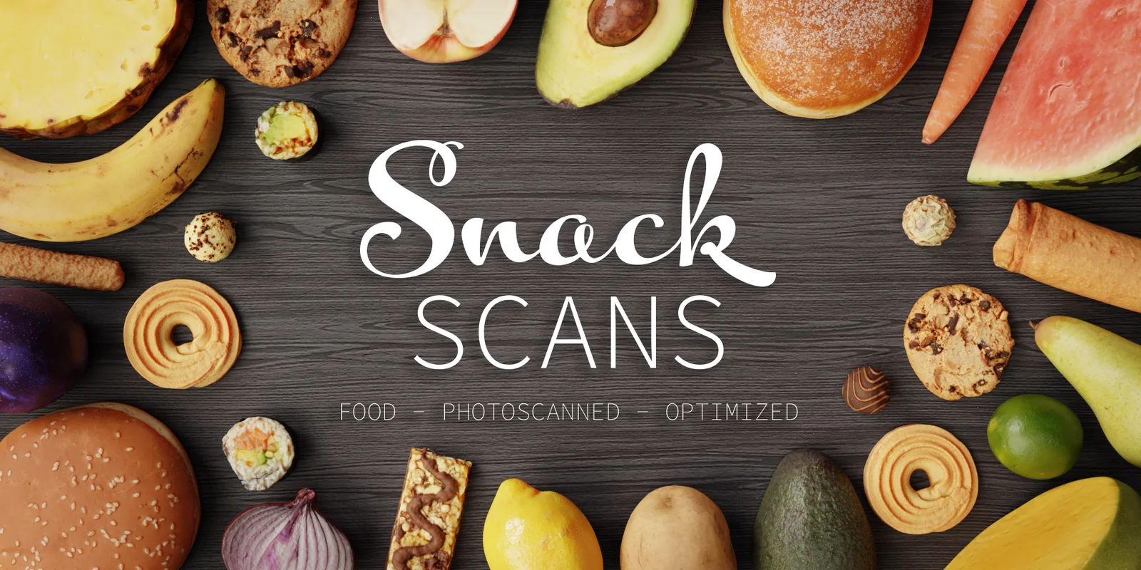Snack Scans is a library of approximately 90 photoscanned 3D food assets divided into seven categories. Each model is based on photogrammetry scans that have been retopologized to a lower polygon count, averaging between 200 and 20,000 polygons. The models include high-resolution texture maps and are set to real-world scale for immediate placement in architectural visualization or character scenes.