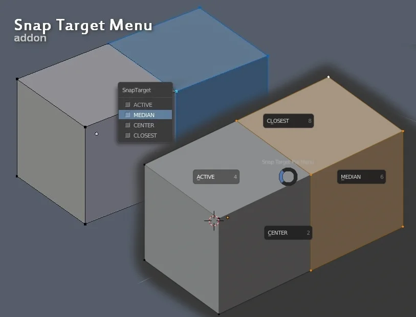 Snap Target Menu is an add-on that provides an independent interface for selecting snap targets, including active, median, center, and closest options. It features a dedicated pie menu that allows users to quickly switch between snapping modes during modeling workflows without navigating the main interface panels.
