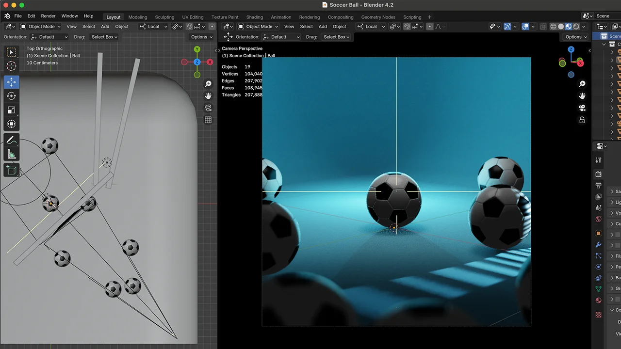 A 3D model of a soccer ball featuring clean topology. The provided Blender file includes a complete lighting and render environment configured for the Cycles engine.