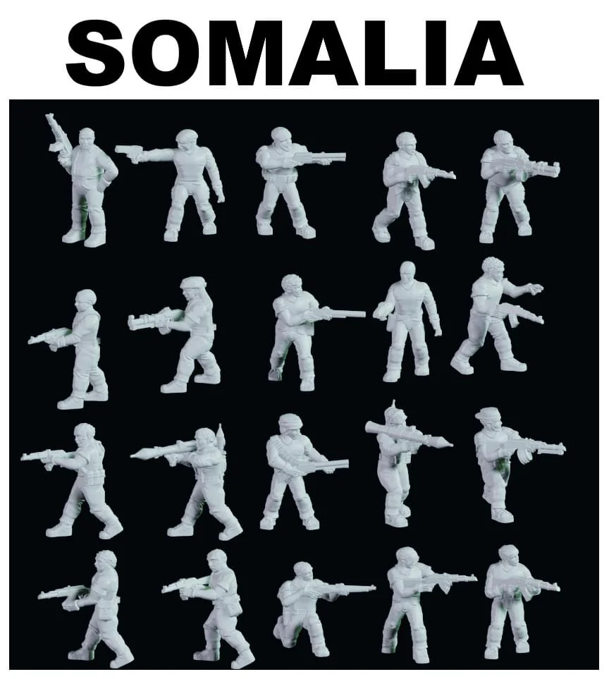 A collection of 3D printable miniature figures featuring a Somalia insurgent theme. These models are designed at 1/100 scale, measuring approximately 18mm tall. The set includes both standard STL files and pre-supported versions ready for use in 3D printing slicers. The figures can be scaled up for larger formats such as 1/72 or 1/56 scale.