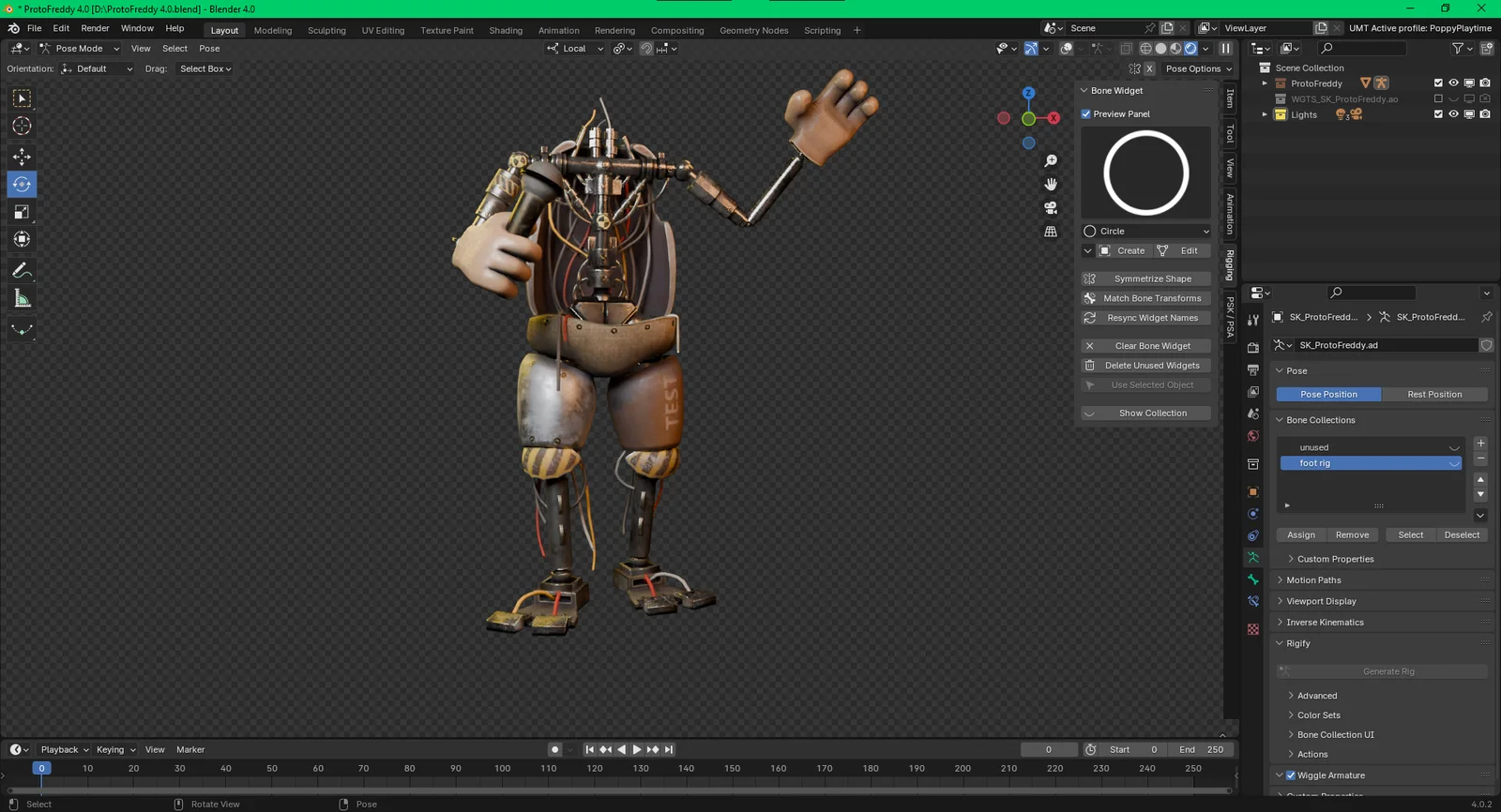 A collection of four rigged character models extracted from Five Nights at Freddy's: Secrets of the Mimic. The pack includes separate Blender files for ProtoFreddy, ProtoBonnie, ProtoChica, and ProtoFoxy. The Bonnie and Chica rigs feature custom properties on the root bone to control which hand holds their respective props.