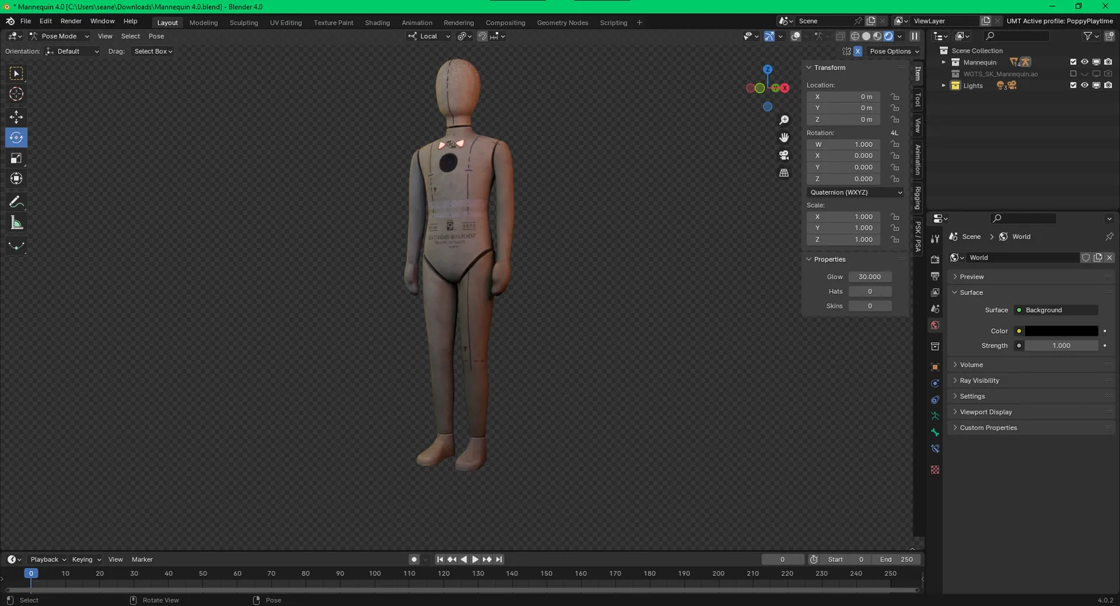 This is a rigged 3D character model of the mannequin extracted from the game Five Nights at Freddy's: Secrets of the Mimic. The character rig includes custom drivers attached to the root bone, allowing users to toggle between different skin textures, glowing effects, and hat accessories.