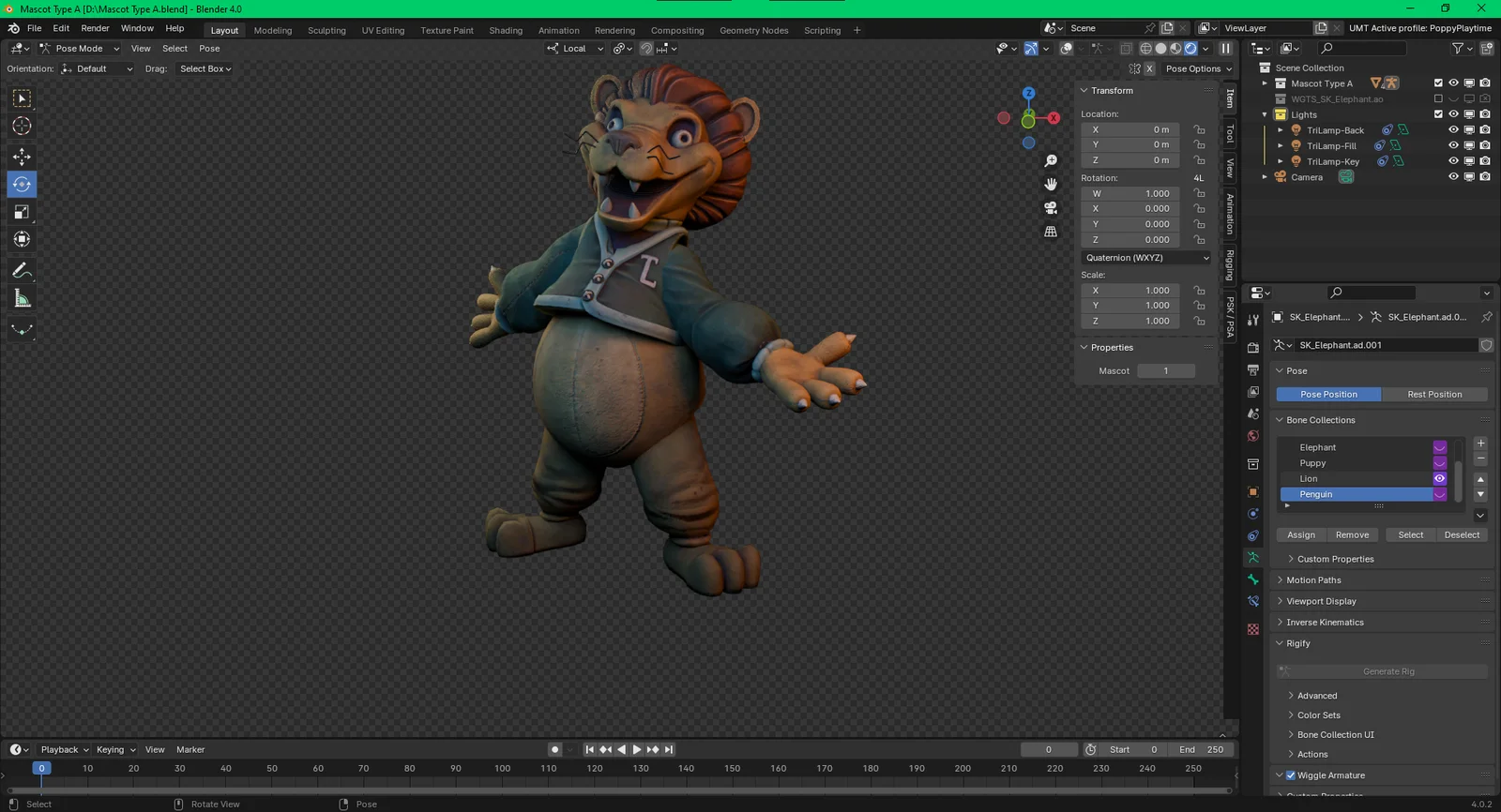 The rig features a driver on the root bone that allows users to switch between the different Type A mascot variations. Additionally, the birthday puppy model includes a material setup with mix factors that can be manually adjusted to swap between three distinct skin textures.