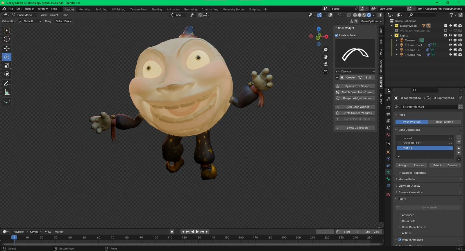 This is a rigged 3D model of the Sleepy Moon character, extracted from the game Five Nights at Freddy's: Secrets of the Mimic. It includes the character's geometry and armature, configured for use in Blender.