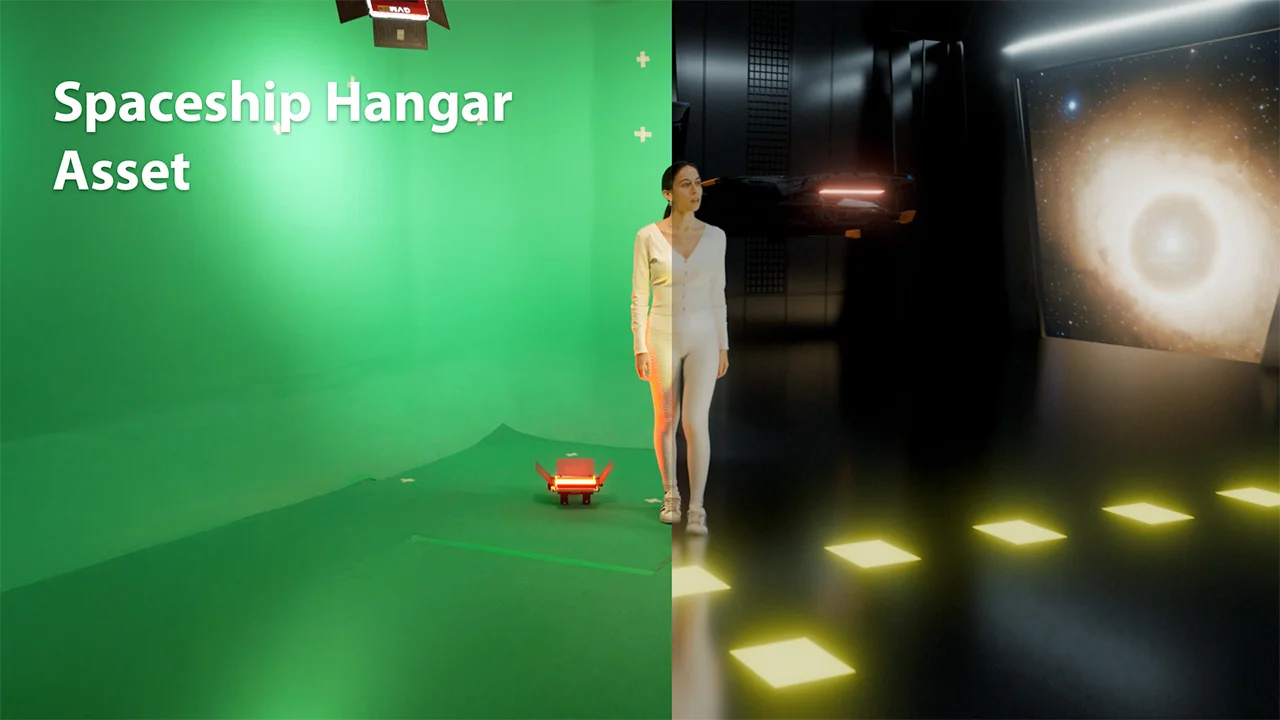 A spaceship hangar 3D environment designed for compositing and motion tracking practice in Blender. The project files complement a tutorial on integrating chroma key footage with a 3D scene. The package includes raw green screen video, pre-keyed footage elements including alpha channels and spill-suppressed video, and full HD motion tracking footage. Multiple Blender files are provided, offering different starting points such as the initial motion tracking setup, the 3D environment, and the completed compositing project.