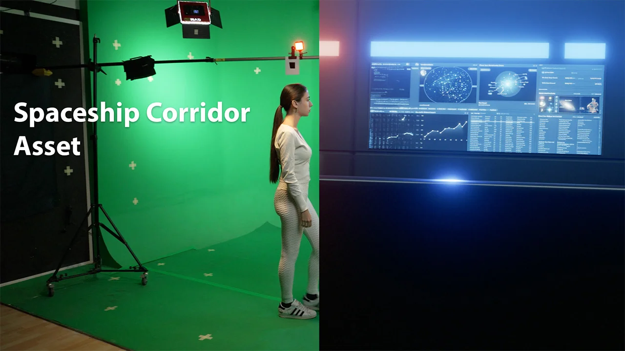 This product provides a spaceship corridor environment designed for chroma key compositing and motion tracking practice in Blender. The package includes raw video footage for tracking, pre-keyed video files with alpha channels for rendering as image planes, and an original green screen clip for manual keying practice. It also contains multiple Blender project files representing different stages of the compositing workflow, allowing users to explore the motion tracking setup, the 3D environment configuration, or the finalized composite scene.