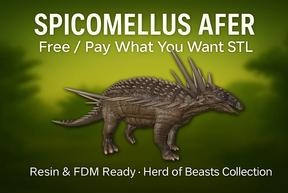 A realistic 3D-printable miniature of the Spicomellus afer, an armored dinosaur known for its distinctive side spikes. The model is a single-piece sculpt designed for 32 mm scale, though it can be scaled for FDM printers. It includes unsupported and pre-supported STL files, along with a Chitubox project file. The model is compatible with both resin and FDM 3D printing.
