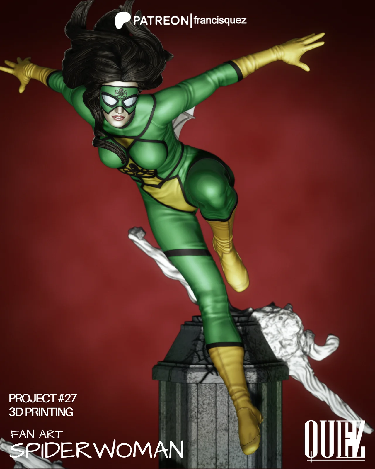 This is a fan-art 3D model of Spider-Woman designed specifically for 3D printing. The figure is scaled at 1/6, with an estimated height of 360mm (14.2 inches), though it can be resized within your chosen slicing software. The geometry is provided in STL format and is separated into multiple pieces to facilitate the printing and assembly process.