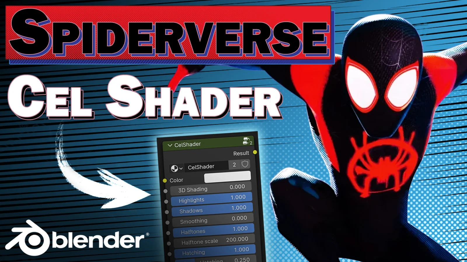 A collection of three character models provided as companion files for a cel shading tutorial in Blender. The package includes models of SpiderGwen, Miles Morales, and Spiderman, intended to be used alongside a video guide covering the steps to create a Spiderverse-style non-photorealistic (NPR) shader.