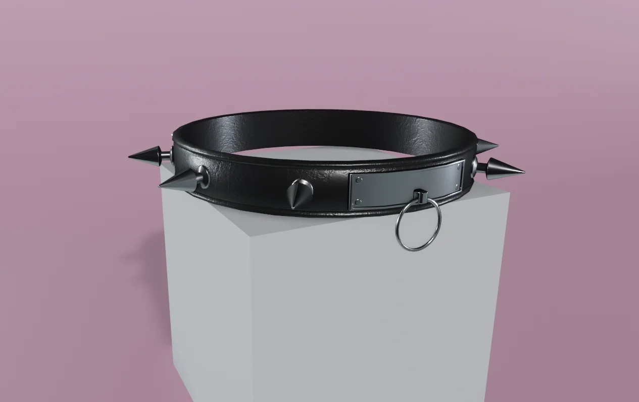 A 3D model of a spiked collar designed for character use. The model is fully weight-painted and features a dedicated armature bone for the front ring. It is provided in FBX format, with two variations included: one utilizing a single combined material and another configured with two separate materials. The asset comes with 4K resolution textures, including base color, metallic, normal, and roughness maps.