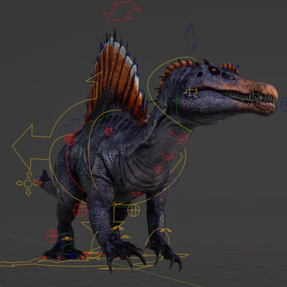 A rigged 3D model of a Spinosaurus dinosaur. The armature is built manually using standard constraints, requiring no additional addons or custom tools to animate.