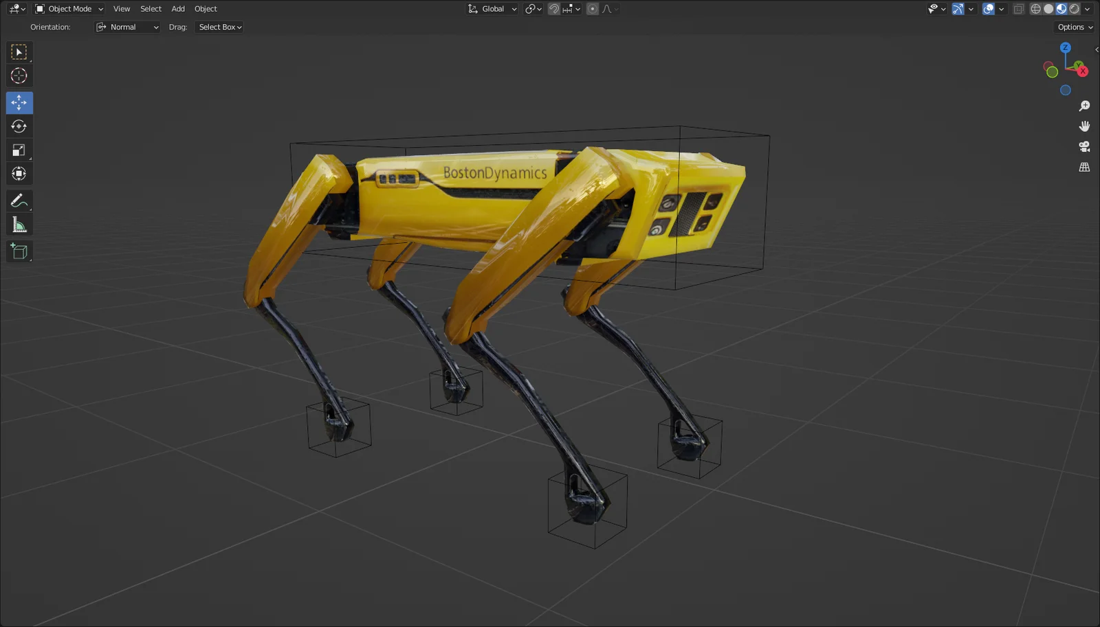 This is a low-poly 3D model of the Boston Dynamics Spot robot that includes a mechanical rig. The rigging setup is constructed using techniques demonstrated in Polyfjord's robotic animation tutorials.