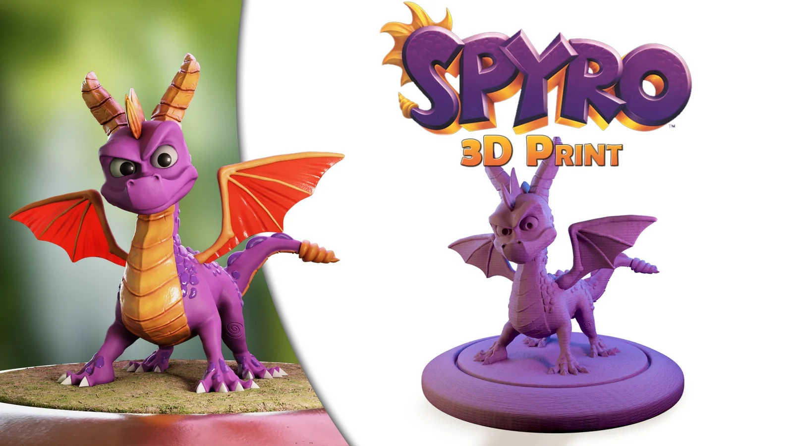 A 3D printable figurine model of Spyro the Dragon. The download includes the STL file prepared for 3D printing. It also includes the original Blender project file, complete with textures and a basic rig for creating custom poses prior to printing.