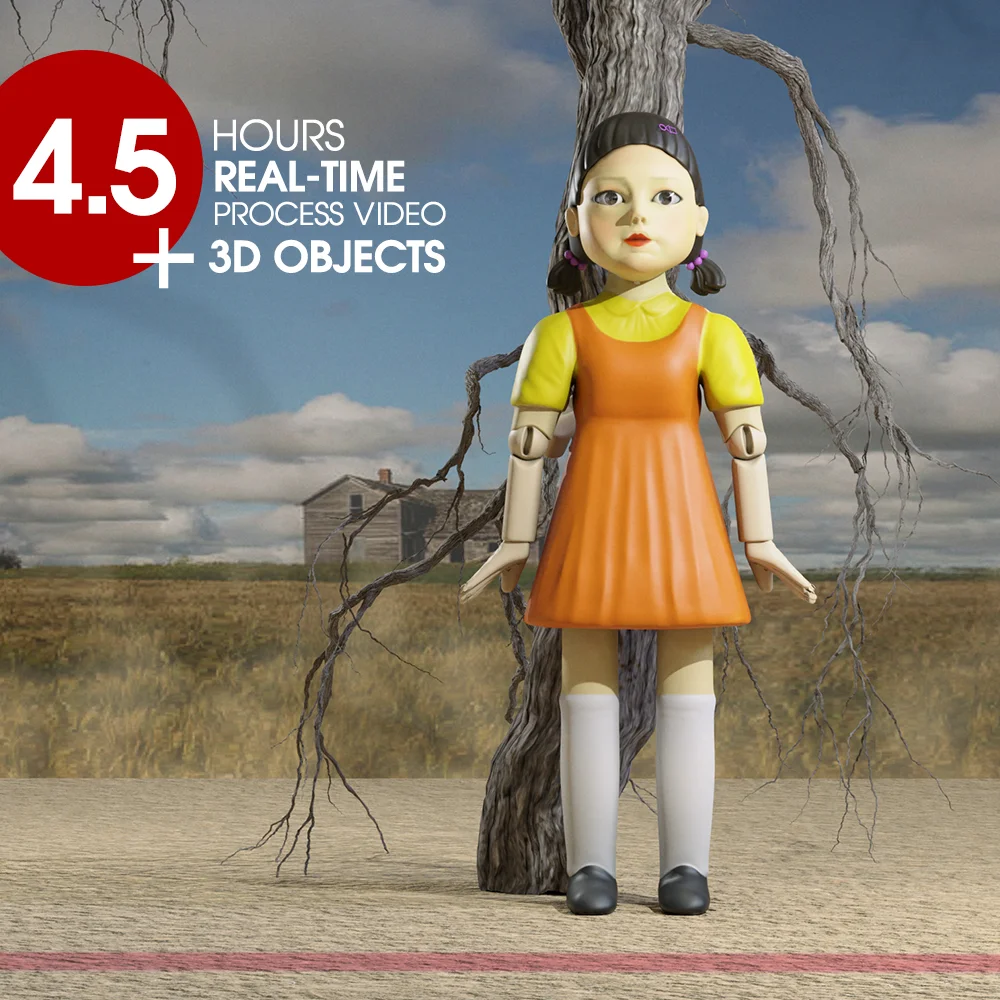 This product contains a 4.5-hour real-time process video demonstrating the creation of the 'Red Light, Green Light' scene from Squid Game from a first-person perspective. The unedited footage shows the complete workflow in Blender 2.93 from start to finish without any voiceover or commentary. The final 3D object files are also provided.