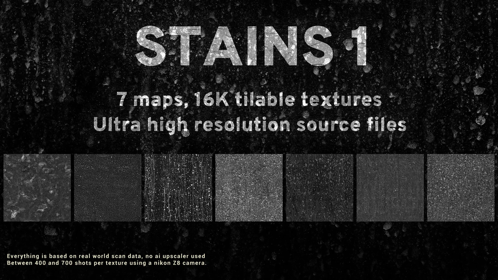 This collection provides six tileable stain imperfection maps captured from real-world data. The textures are created through a scanning process involving multiple photographs, avoiding the use of AI upscaling or automated generation. The edges are manually hand-painted to ensure seamless tiling.