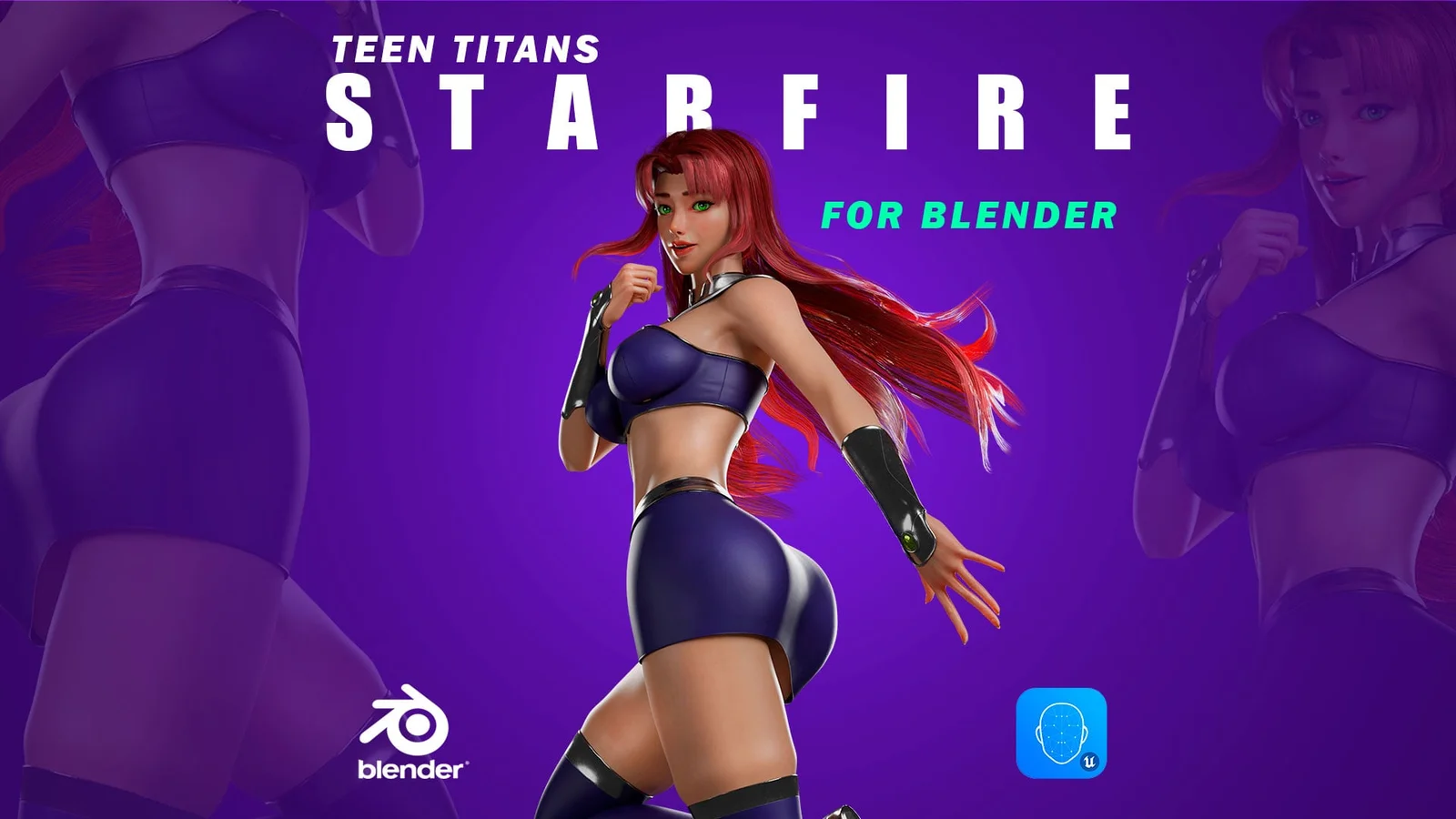 A fully rigged 3D character model of Starfire, designed for animation and rendering in Blender. The model features complete body and facial rigging, allowing for detailed expressions and poses. It comes equipped with three distinct, highly detailed character costumes.