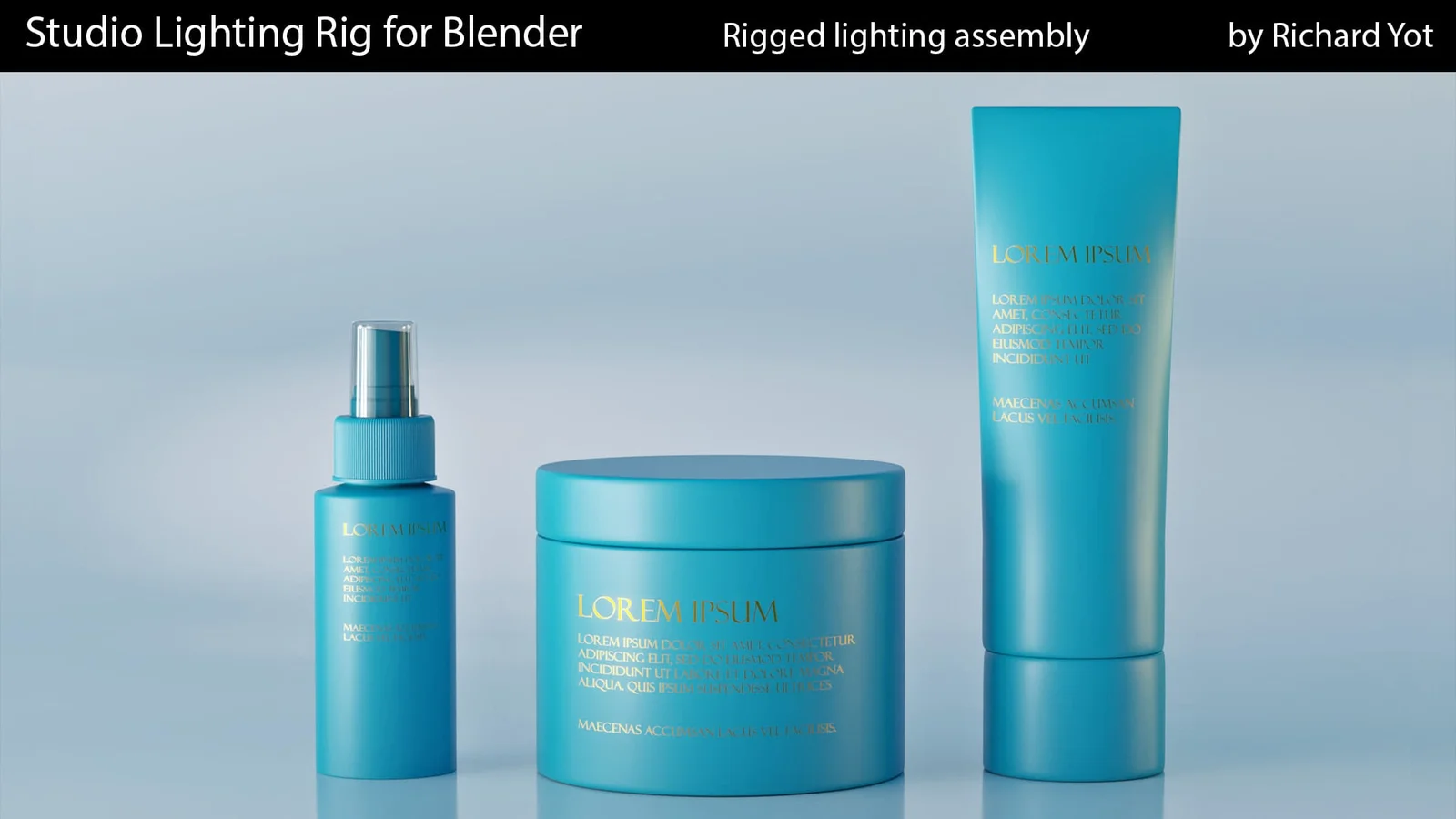 This lighting rig provides 16 different types of studio lights, including softboxes, spotlights, and umbrellas, allowing users to interactively cycle through them. The lights utilize HDR images rather than standard area lights, which provides more detailed reflections and helps maintain render performance when multiple lights are active. The package also includes four custom studio environments designed for different rendering scenarios, including specialized setups for glassware and transparent objects. The rig features built-in controls for adjusting light visibility, brightness, and direction.