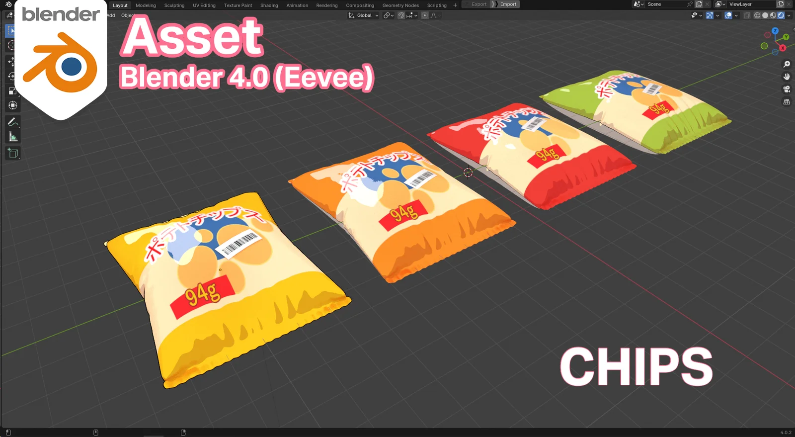 This asset provides a stylized bag of chips modeled in Blender. It features a toon shader configured for Eevee, allowing for adjustments to glossy highlights and shadows. The shader utilizes organized node setups for clarity. The package includes four base color textures in yellow, orange, red, and green, along with a barcode texture for added detail.