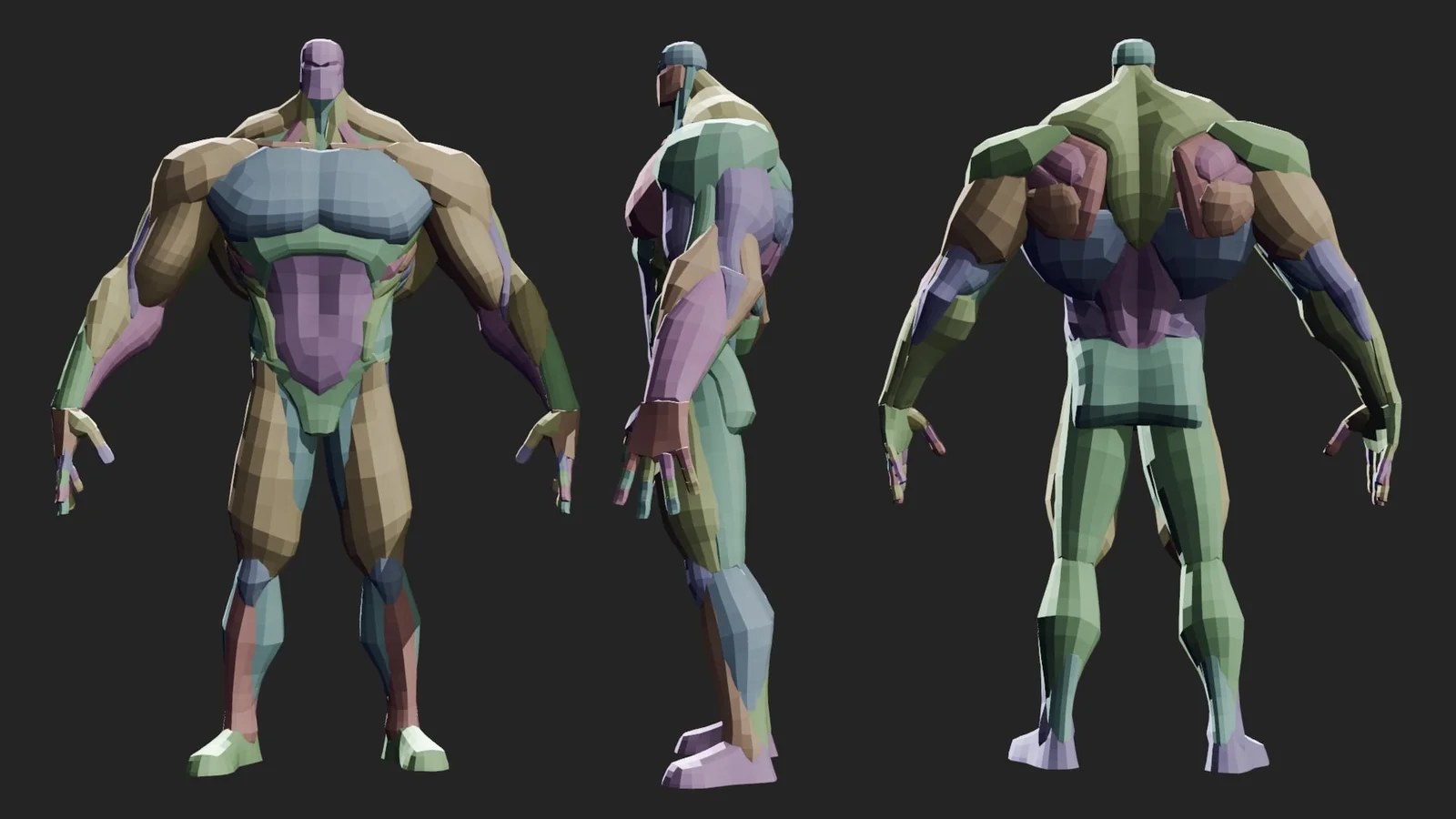 This product is a stylized, muscular character blockout designed to serve as a base mesh for sculpting and character creation. The model is separated into distinct anatomical parts, including the head, torso, arm, hand, and leg. It is provided in .blend, .fbx, and .obj formats, making it suitable as a starting point for superhero or similar muscular character projects.