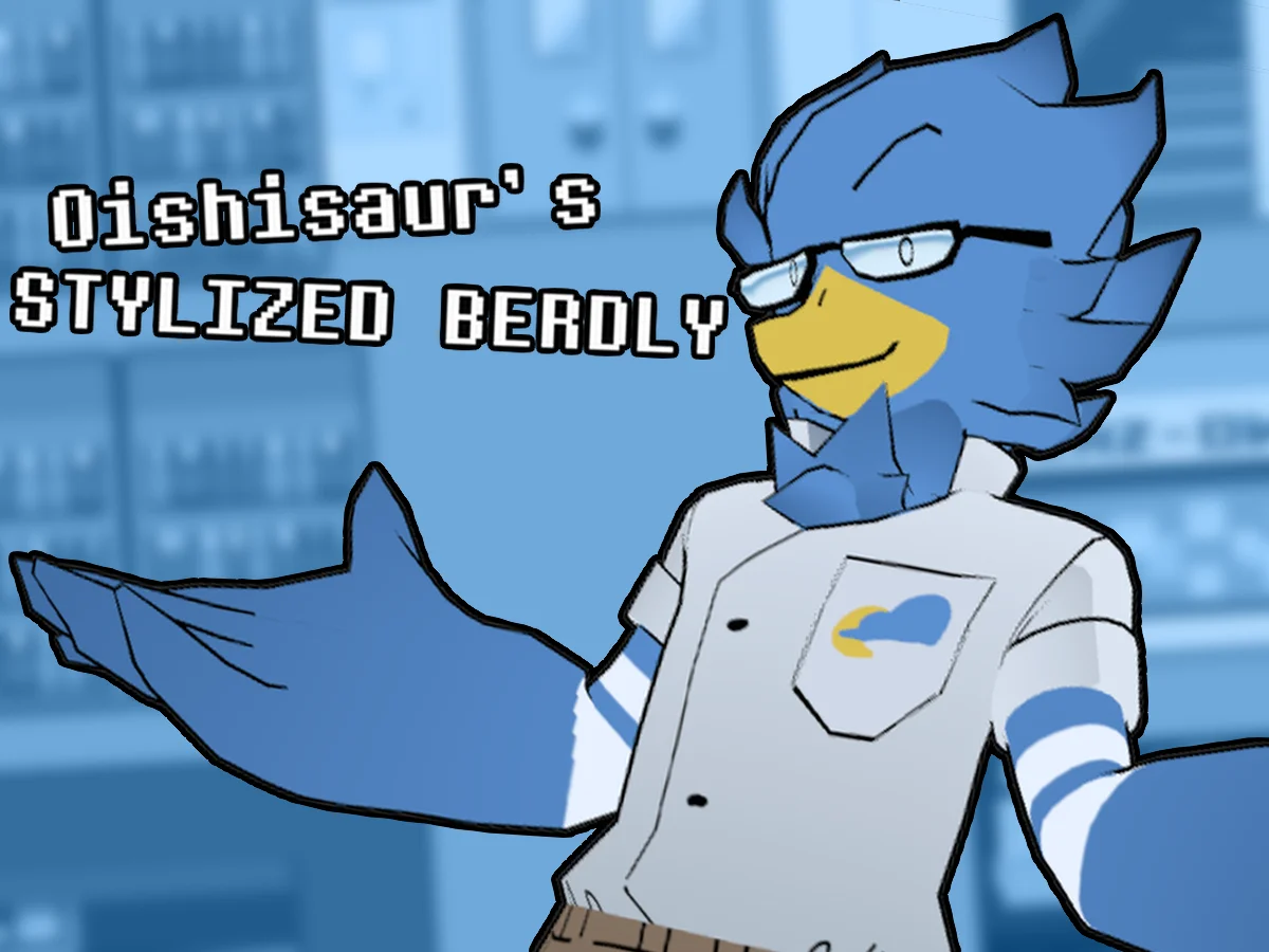 A stylized 3D character model of Berdly from Deltarune. The model includes shape keys for facial expressions, such as happy, mad, sad, shock, and stare, alongside visemes configured for use in VRChat. Additionally, the asset pack contains Berdly's Deltarune attire, a halberd weapon, books, and a gaming system prop.