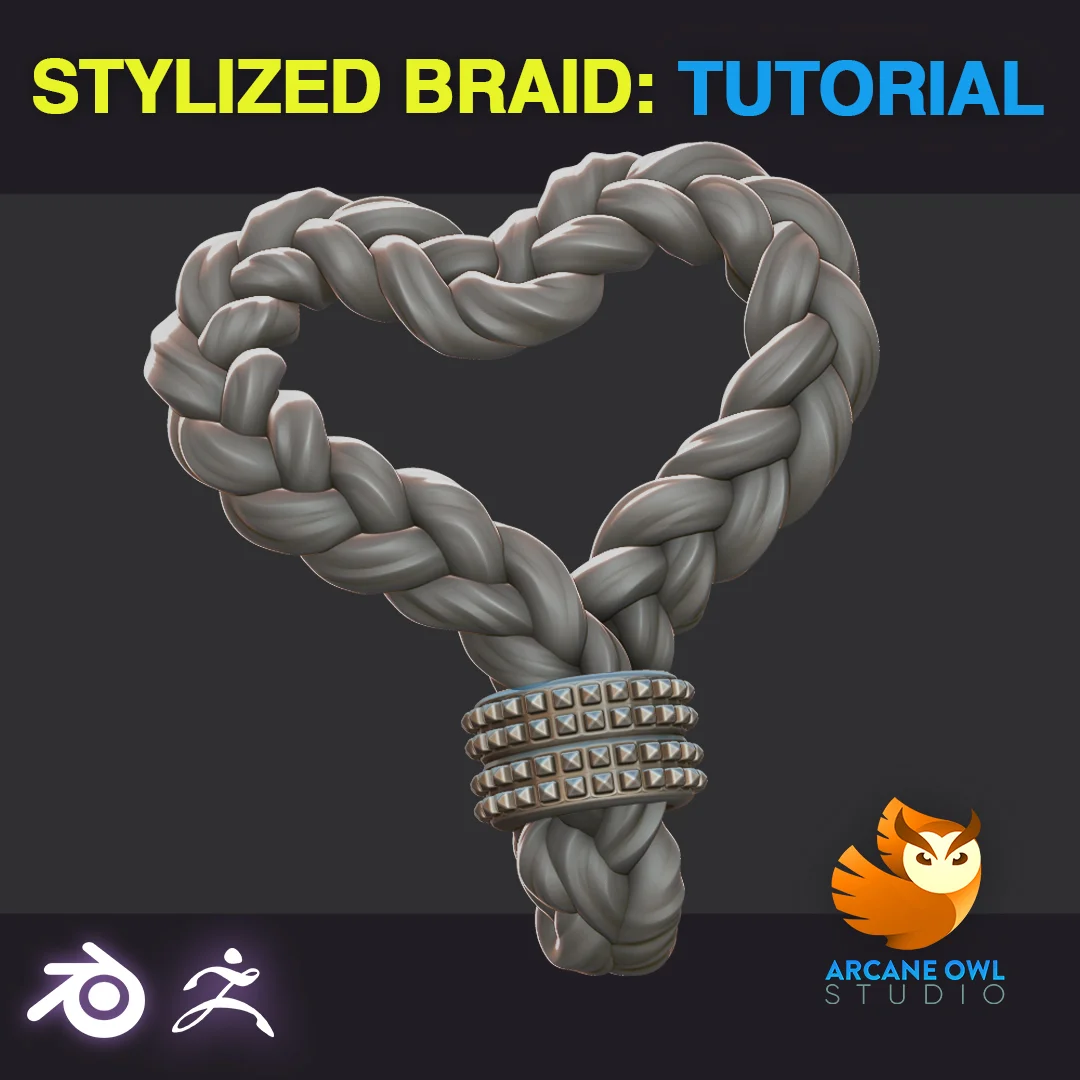 A 30-minute video tutorial demonstrating how to create stylized braids from scratch. The instruction covers two different braid shapes: a regular or wiggly style and a heart-shaped variant. The workflow utilizes ZBrush and Blender, and the package includes the final project files in ZBrush, ZTool, Blender, and FBX formats. Additional resources such as a custom ZBrush UI, plugin links, brushes, render options, and matcaps are also provided.