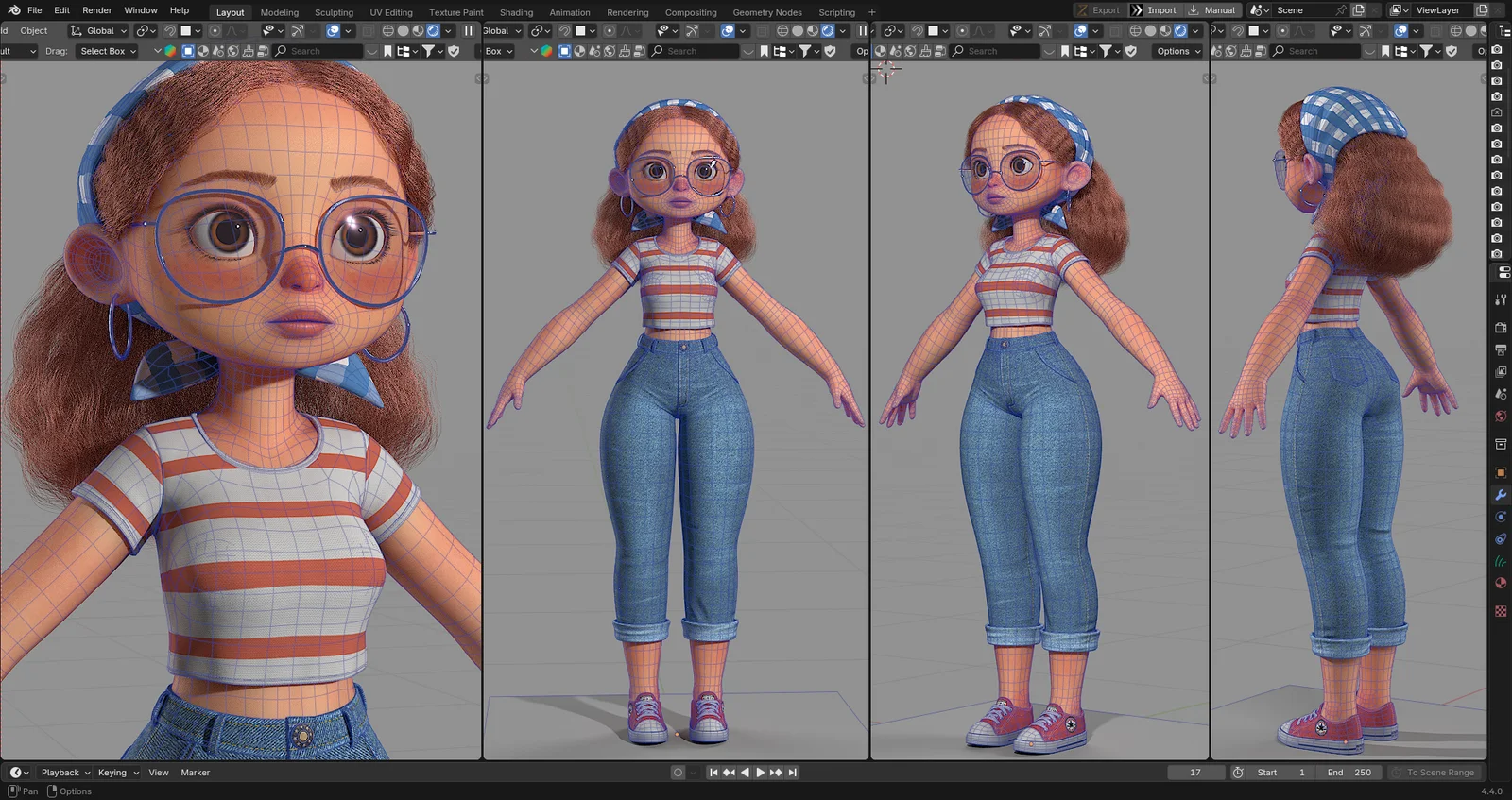 This resource provides a comprehensive look at creating a stylized character in Blender. It includes 22 high-definition process videos demonstrating the workflow, along with the complete project files for the character. The videos are presented without audio or voiceover, showing the modeling process at normal, 1.5x, and 2x speeds. The included project files are compatible with Blender 4.0 through 4.4 and utilize the EEVEE and Cycles render engines. The demonstrated workflow also incorporates the BlendKIT, Rigify, and UVsquares add-ons.