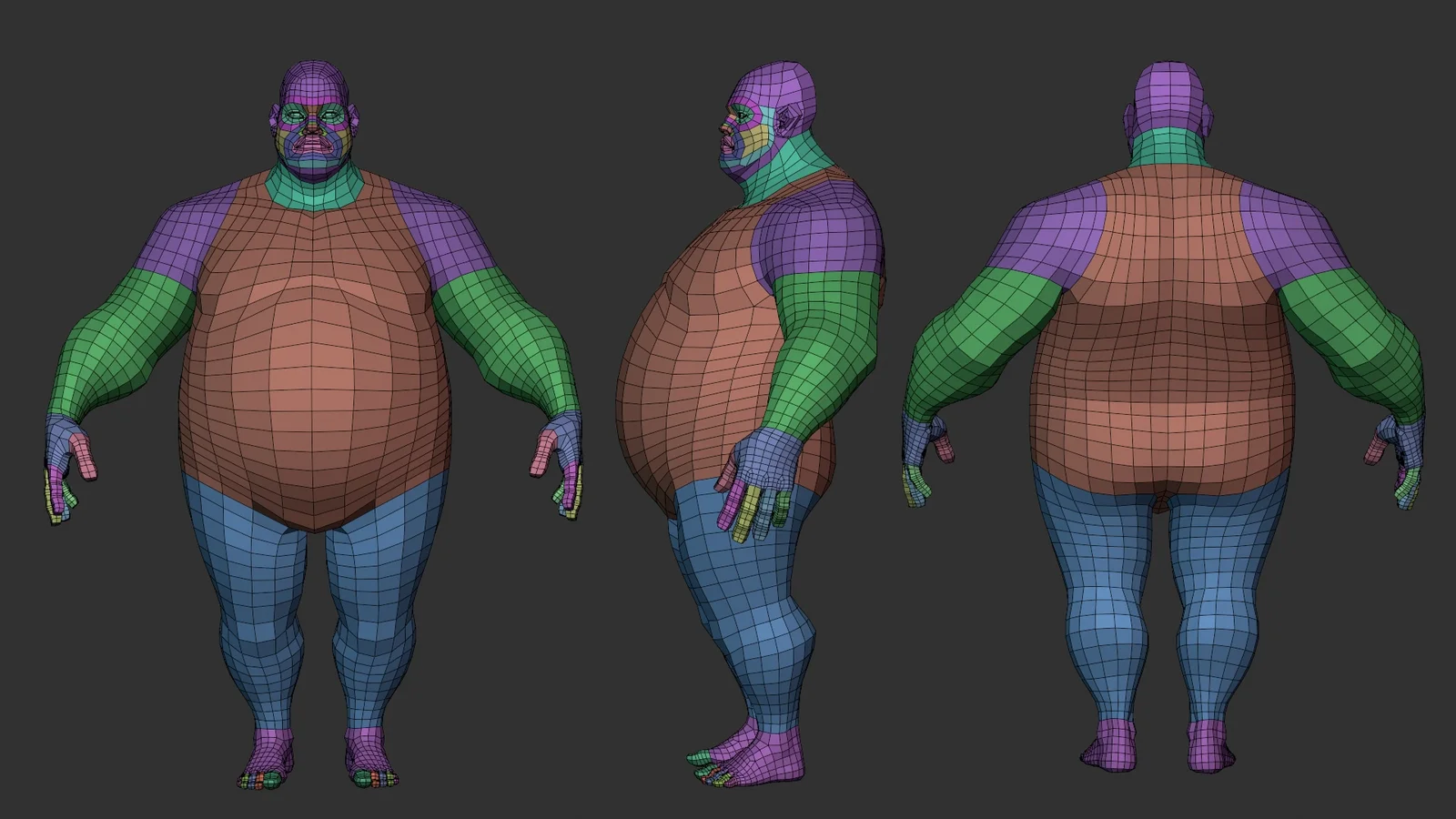 A stylized, fat, low-poly character basemesh designed as a starting point for sculpting. The mesh features distinct face sets for each limb and individual fingers, allowing for easy manipulation using Blender's pose brush. It includes fully modeled hands, fingers, feet, and toes, with a low-polygon face topology optimized for establishing primary forms. The model is provided without UV mapping in .blend, .fbx, and .obj formats.