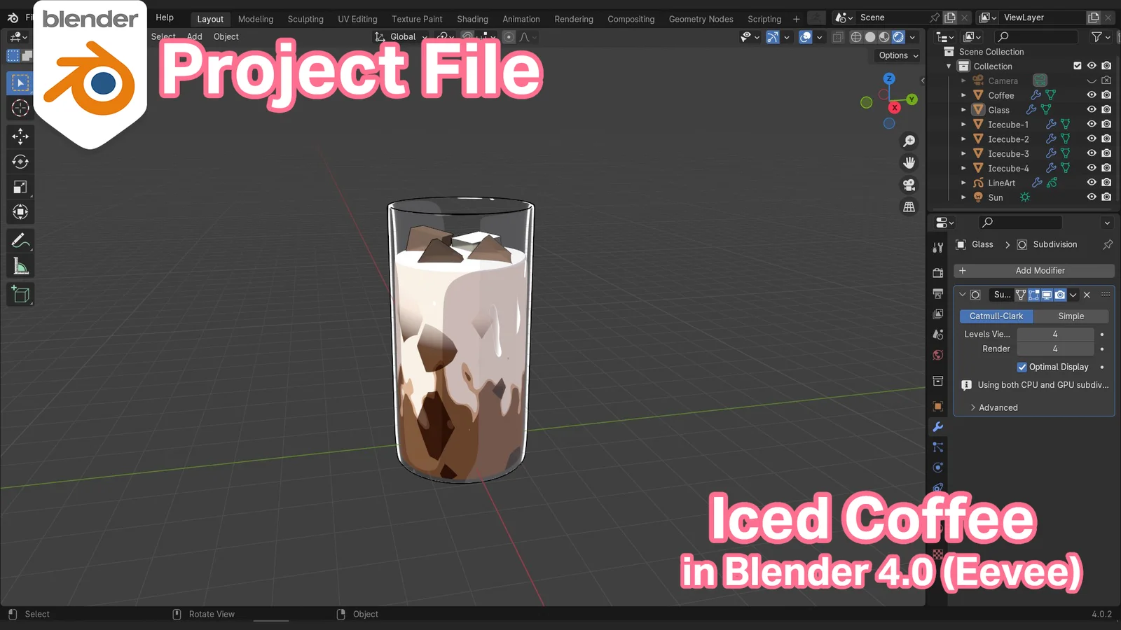 A Blender project file featuring an anime-style iced coffee prop. Designed for users interested in exploring stylized creation workflows, the file includes the complete material and EEVEE render setup. The model does not contain baked textures or UV maps, relying instead on its specific shader configuration to achieve the stylized look.