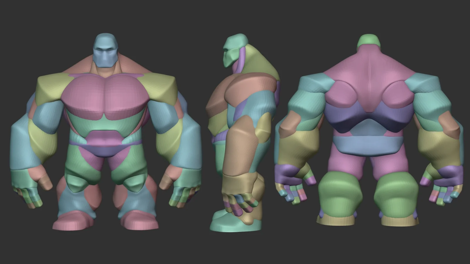 A stylized anatomy blockout model designed as a starting point for large, muscular characters. The base mesh is separated into distinct body parts, including the head, torso, arms, hands, legs, and feet. It serves as a foundation for further sculpting and character development.