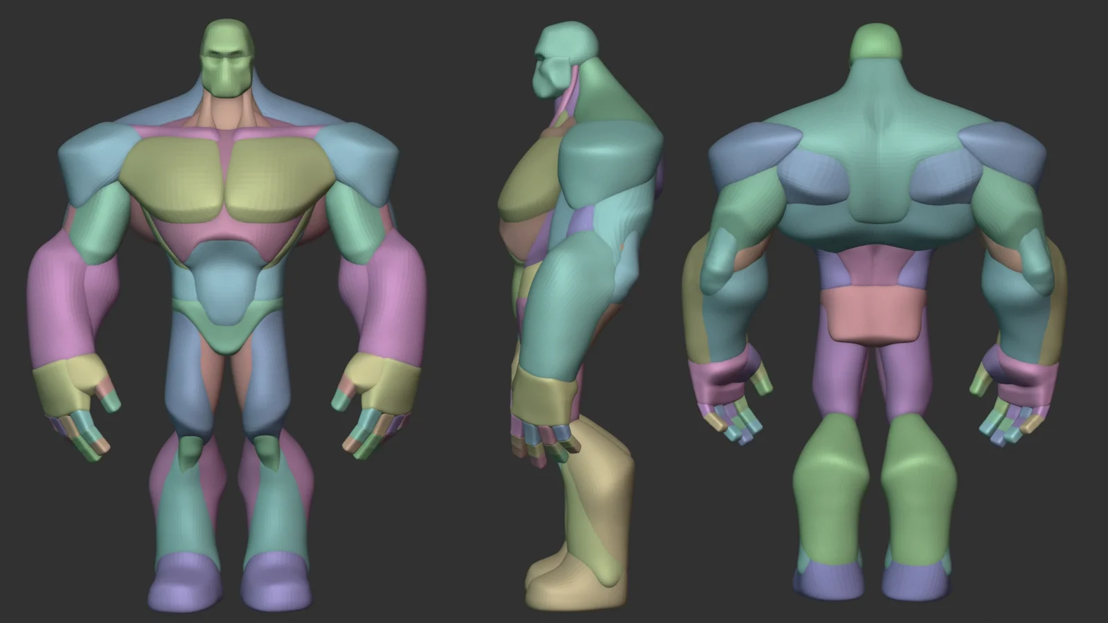 This product provides a stylized male anatomy blockout designed to serve as a base mesh for character sculpting and modeling. Modeled in an "Infinity" style, the character is separated into distinct anatomical components, including the head, torso, arms, hands, legs, and feet. The asset is provided in .blend, .fbx, and .obj formats to accommodate various 3D workflows.