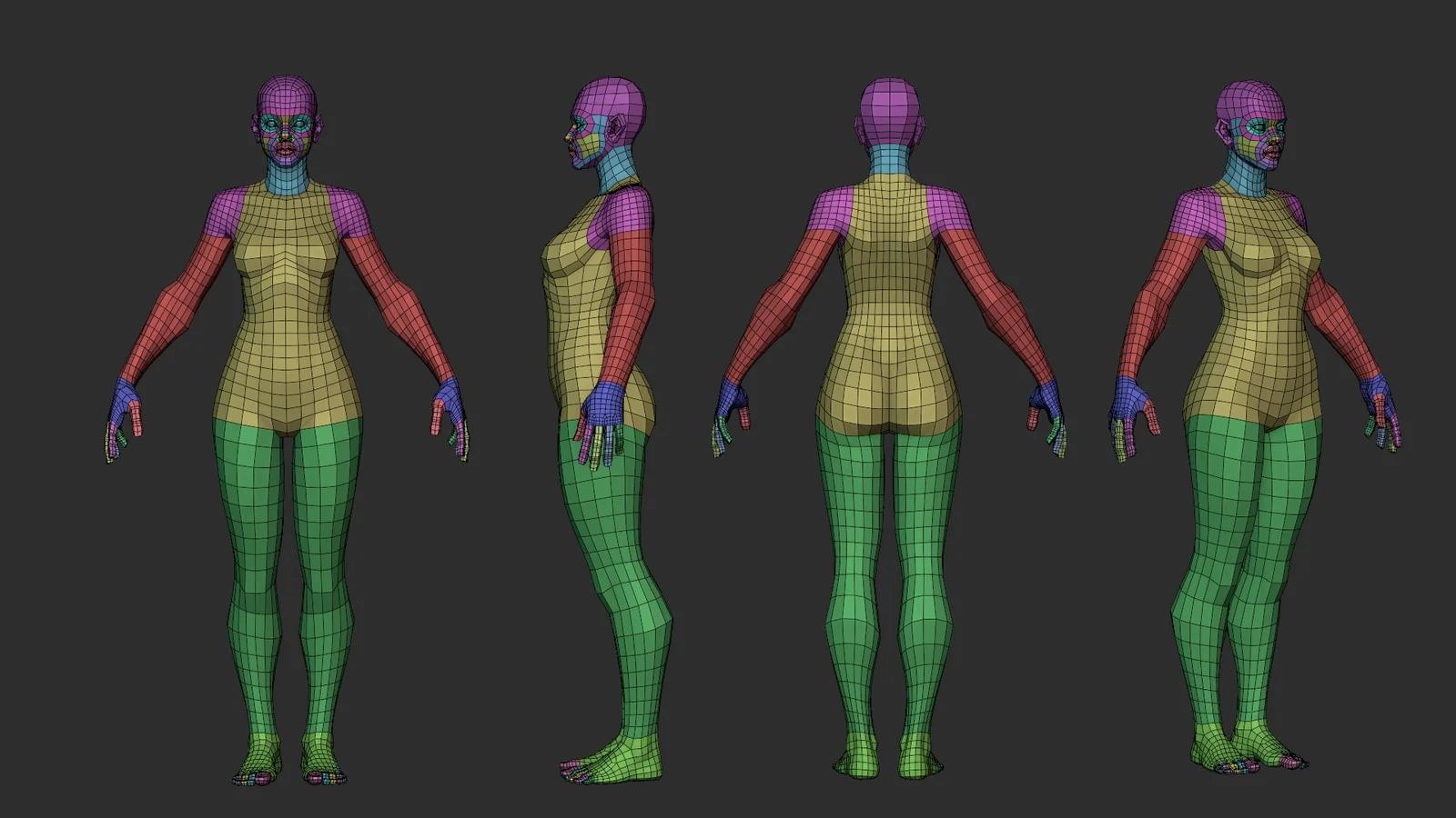 This is a stylized, low-polygon female base mesh designed as a starting point for character sculpting and modeling. The mesh includes fully modeled hands, fingers, feet, and toes. To assist with the sculpting workflow, each limb and individual finger is assigned its own face set, allowing for easier manipulation using Blender's pose brush. The face geometry is kept low-resolution to facilitate establishing primary forms before adding subdivision. The model is provided in .blend, .fbx, and .obj formats and currently does not include UV mapping.