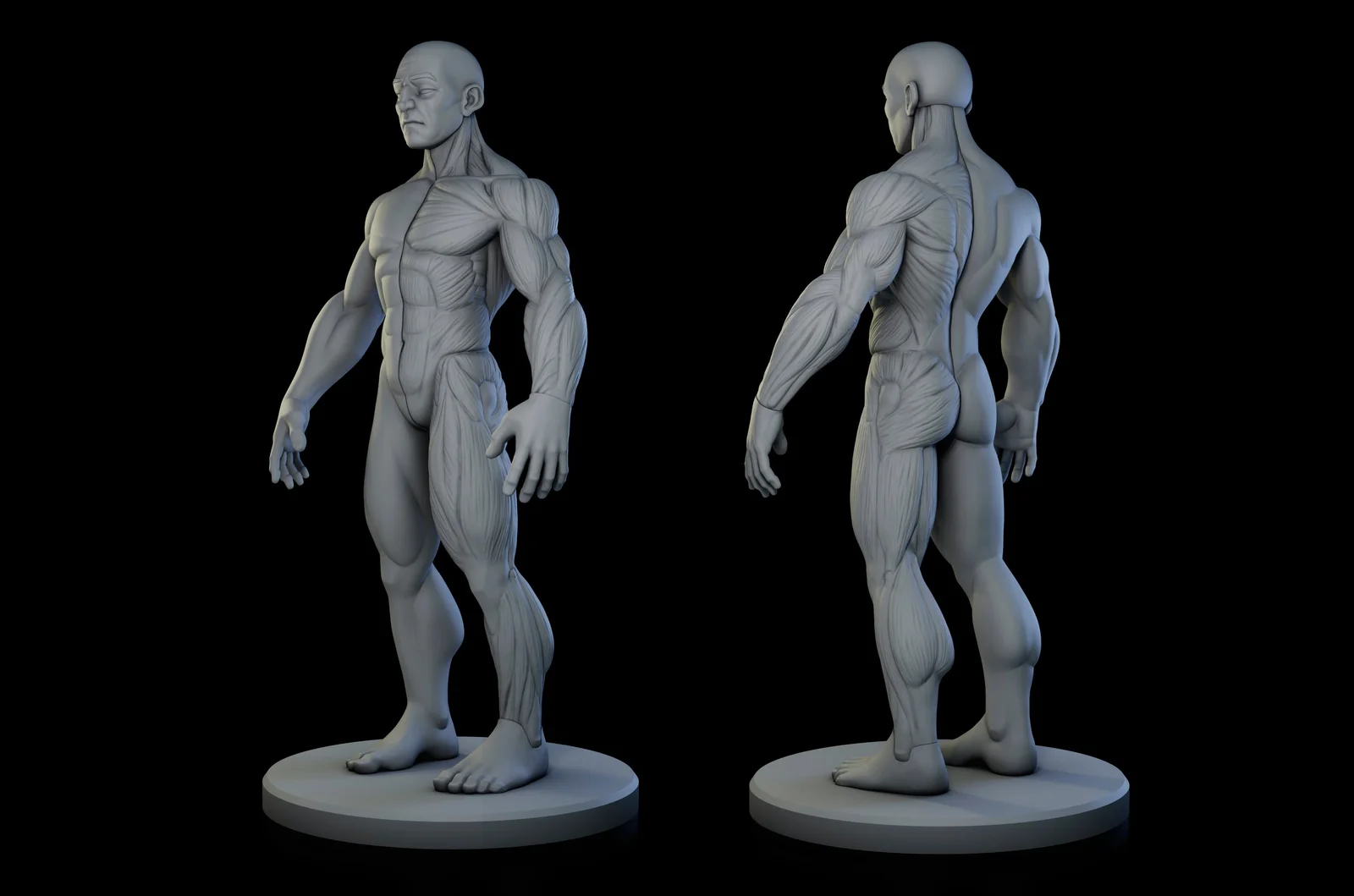 A stylized human male model designed for use as a sculpting reference and for 3D printing. The package includes three variations: a half ecorche with visible arm, torso, and leg muscles, a semi-clothed version, and a fully unclothed version. These models illustrate how to simplify muscle anatomy for stylized character creation. A low-poly, UV-unwrapped base mesh is also included for integration into character creation workflows.