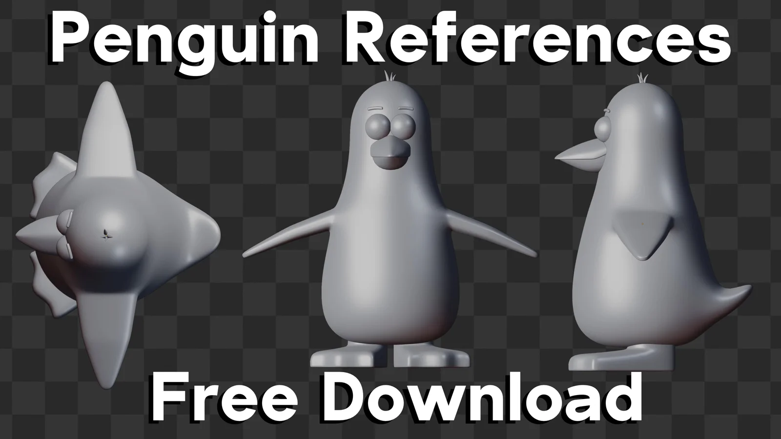 A set of front, side, and top orthographic reference images designed for a beginner character creation tutorial in Blender. These references are used as a guide to model a stylized penguin character and are provided under a CC0 license for personal or commercial use.