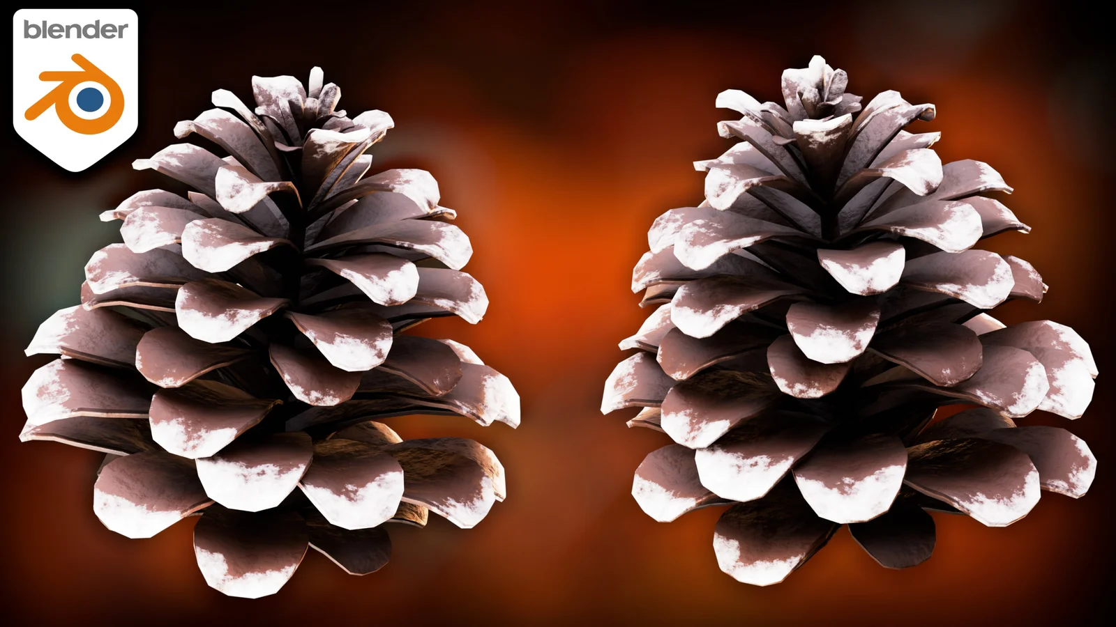 A set of two stylized 3D pinecone models. The project files include procedural materials for the pinecones, with one variation featuring snow and the other without. These assets were originally created as part of a Christmas wreath tutorial.