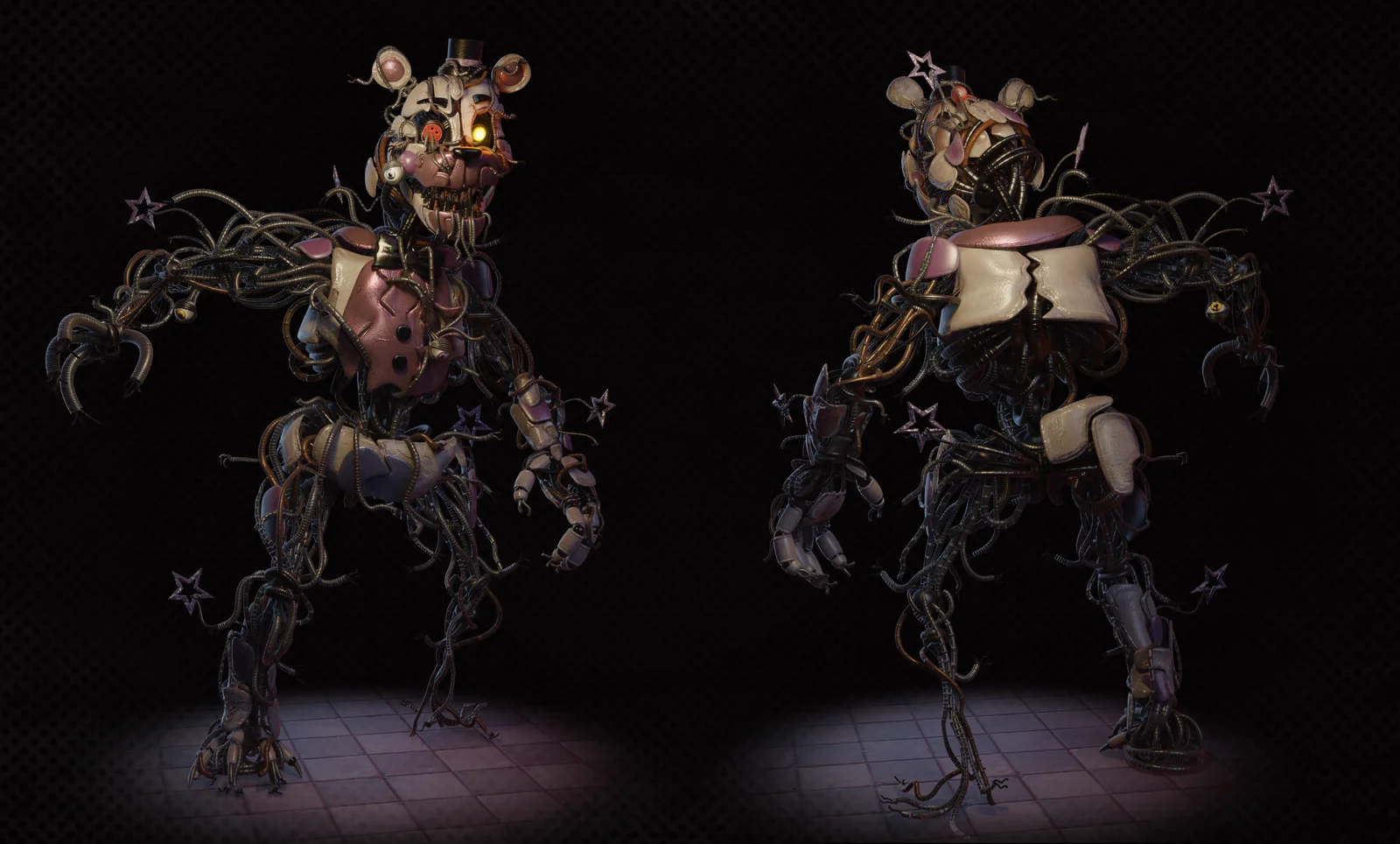 This is a stylized 3D character model of Molten Freddy, reimagined from the game Five Nights at Freddy's Pizzeria Simulator. The design incorporates elements inspired by past characters such as Ennard and Funtime Freddy. The asset includes 2K resolution textures and is equipped with a simple forward kinematics rig, containing no inverse kinematics (IK) or drivers.