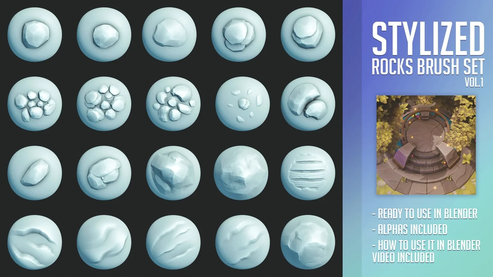 A collection of 20 stylized alpha brushes designed for sculpting rocks and stone textures in Blender. The set includes a .blend file for appending the brushes directly into your projects, alongside the source alpha maps provided in EXR and PSD formats. Video instructions are included to guide users through the installation process, including specific steps for the updated brush library system introduced in Blender 4.3.