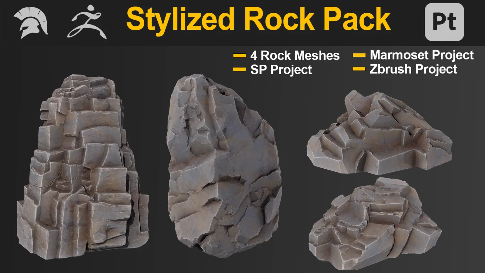 This collection provides four stylized rock meshes suitable for scene composition and game development workflows. Each rock model includes both high-polygon and low-polygon variations that are fully unwrapped. The assets are pre-textured utilizing baked maps to provide surface detailing.
