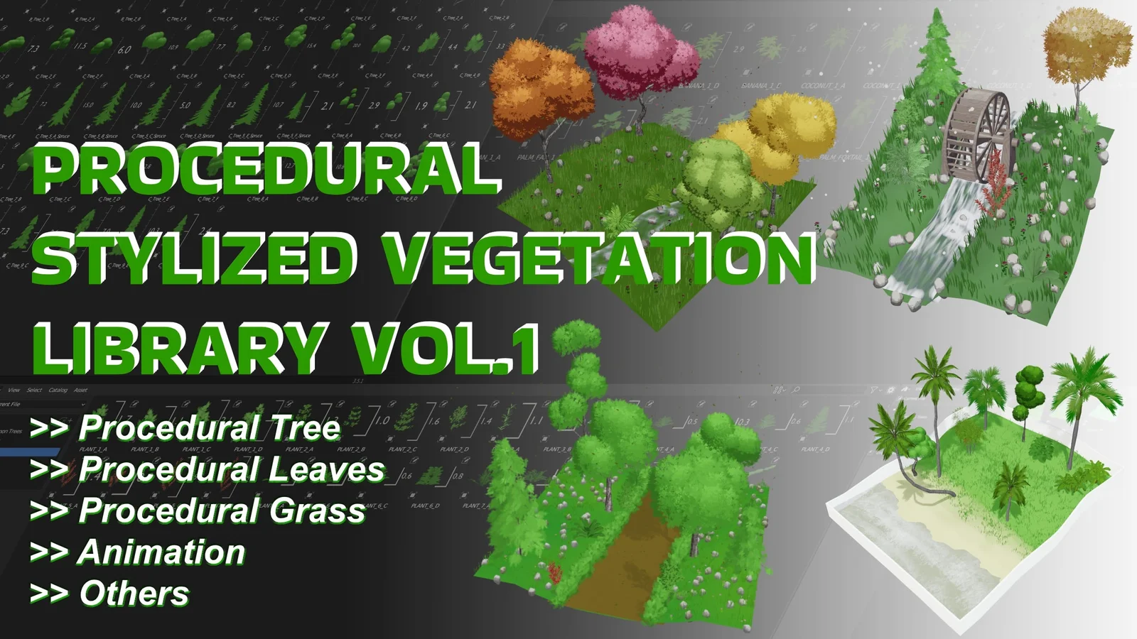 UitTree Stylized Vegetation Generator Library Vol.1 provides a collection of procedurally generated stylized trees, plants, grass, and environmental elements. The assets are optimized with stylized materials and integrate into Blender's Asset Browser for drag-and-drop workflow.