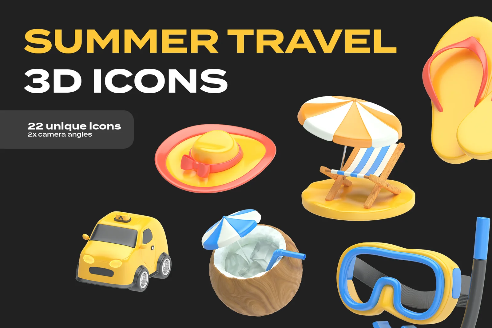 This asset pack provides a collection of 22 3D icons focused on summer travel themes. The product includes the original Blender files, allowing users to modify the icons to fit specific project requirements.