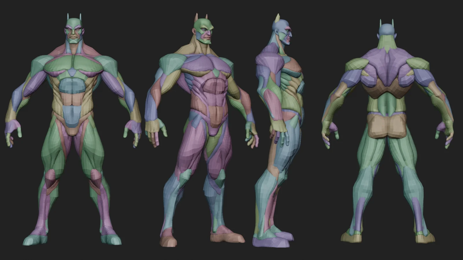 This product provides a stylized superhero anatomy blockout model, suitable as a base mesh for character creation. The model includes separated elements for the head (featuring basic eye, nose, and ear details), torso, arms, hands, and legs. It is designed to assist in establishing proportions and foundational anatomy for stylized, heroic character designs.
