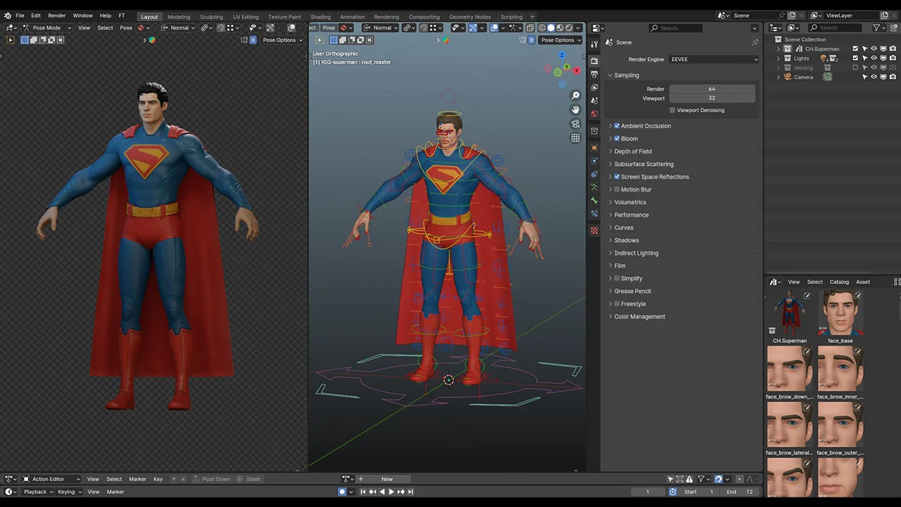 The rig features a custom, fully functional face rig with automation and individual tweak controls, as well as a dedicated cape rig. It also includes finger IK/FK with master controls, a visibility mask, and a pose library containing predefined face and hand poses. The model comes with basic PBR shaders ready for use in both Cycles and EEVEE render engines.