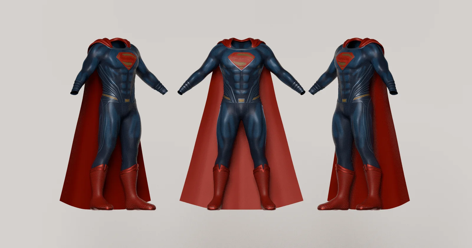 A 3D model of a Superman suit featuring clean topology designed for rigging and animation workflows. The asset includes 4K PBR textures, providing color, normal, roughness, and metalness maps. It comes as a ready-to-use .blend file with pre-configured materials optimized for both Cycles and EEVEE render engines. Note that this product contains only the suit geometry; a character body and head are not included.