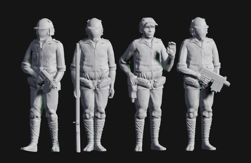 A collection of four miniature figures prepared for resin 3D printing. The models are nominally scaled at 1/48, measuring approximately 38mm from toe to the top of the head, and include presupported files. They are designed primarily for resin printers, though scaling adjustments can be made within a slicer for different size requirements.